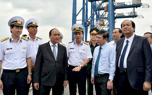| Thủ tướng thị sát khu vực cảng của Tổng công ty Tân cảng Sài Gòn (Ảnh: Vũ Dũng) |