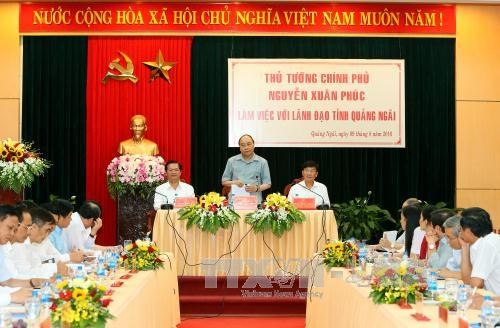 Ghi nhận tỉnh đã từng bước chuyển dịch cơ cấu nền kinh tế, chú trọng nhiều hơn đến phát triển doanh nghiệp và bước đầu chủ động trong quản lý Nhà nước, điều hành kinh tế-xã hội, Thủ tướng chỉ rõ những tiềm năng phát triển của tỉnh trong tương lai và đề nghị tỉnh cần tiếp tục giải quyết tốt mô hình kinh tế nông nghiệp, công nghiệp chế biến, nâng cao giá trị và phát triển dịch vụ phù hợp với quy luật thị trường. Thủ tướng gợi ý Quảng Ngãi tiếp tục rà soát, bổ sung và hoàn thiện quy hoạch, nhất là quy hoạch phát triển hạ tầng giao thông; xây dựng, hoàn thiện đầu mối, hệ thống chính quyền năng động, sáng tạo. Đặc biệt, tỉnh Quảng Ngãi chú ý làm tốt công tác an sinh xã hội, chăm lo cho đối tượng chính sách, người có công và người nghèo; không để đồng bào bị đứt bữa, thiếu ăn, nhất là khu vực miền Tây Quảng Ngãi. Làm tốt công tác chăm lo, hỗ trợ ngư dân hành nghề đánh bắt, khai thác thủy hải sản, để người dân yên tâm hành nghề, bảo vệ chủ quyền biển đảo Tổ quốc.
