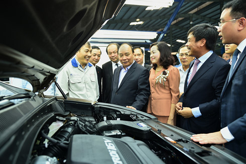 | Lãnh đạo công ty giới thiệu với Thủ tướng Nguyễn Xuân Phúc về sản phẩm ô tô do công ty lắp ráp |