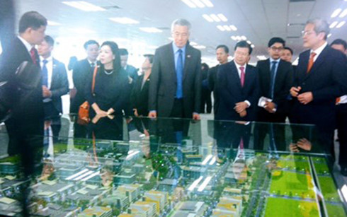 | Thủ tướng Singapore Lý Hiển Long và Phó Thủ tướng Trịnh Đình Dũng tham quan mô hình toà nhà |