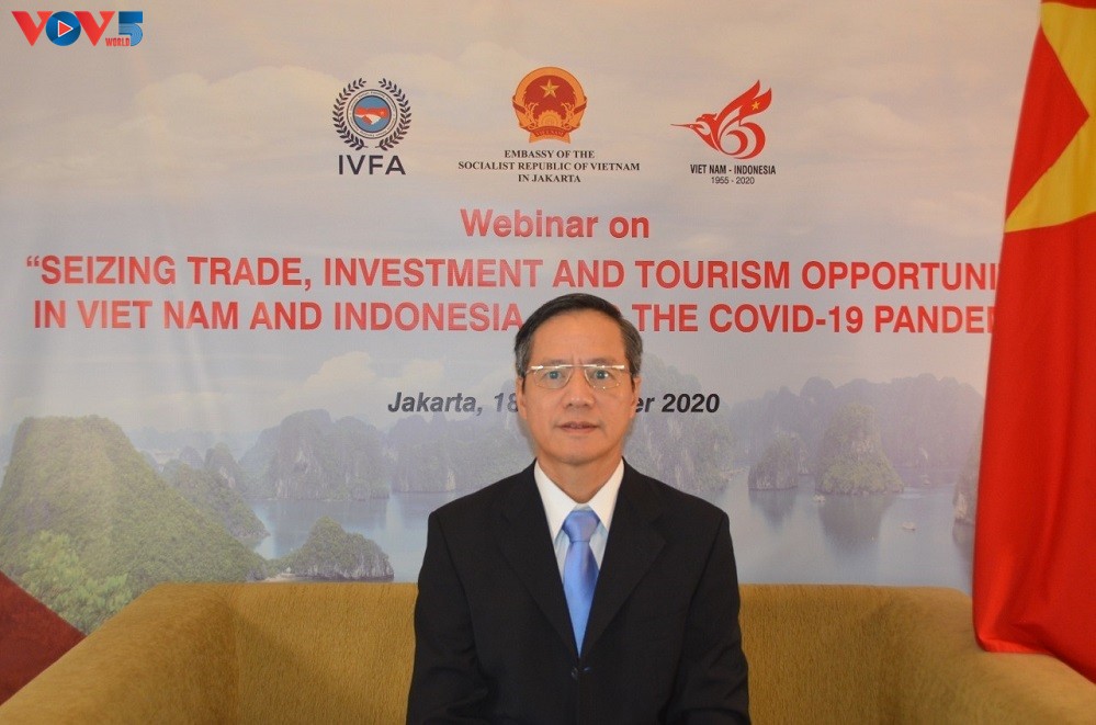 Nhằm thúc đẩy hợp tác kinh tế cùng có lợi giữa Việt Nam và Indonesia trong bối cảnh đại dịch Covid-19, ngày 18/11, Đại Sứ quán Việt Nam tại Indonesia phối hợp với Hội Hữu nghị Indonesia – Việt Nam tổ chức hội thảo trực tuyến “Nắm bắt cơ hội thương mại, đầu tư và du lịch tại Việt Nam và Indonesia trong bối cảnh đại dịch COVID-19. Đại sứ Việt Nam tại Indonesia Phạm Vinh Quang, Đại sứ Indonesia tại Việt Nam Ibnu Hadi, cùng nhiều quan chức của các bộ/ngành, lãnh đạo địa phương của hai nước, tham dự hội thảo. Ngoài ra, khoảng 150 người tham gia trực tuyến và đông đảo doanh nghiệp quan tâm theo dõi qua các nền tảng truyền thông xã hội.