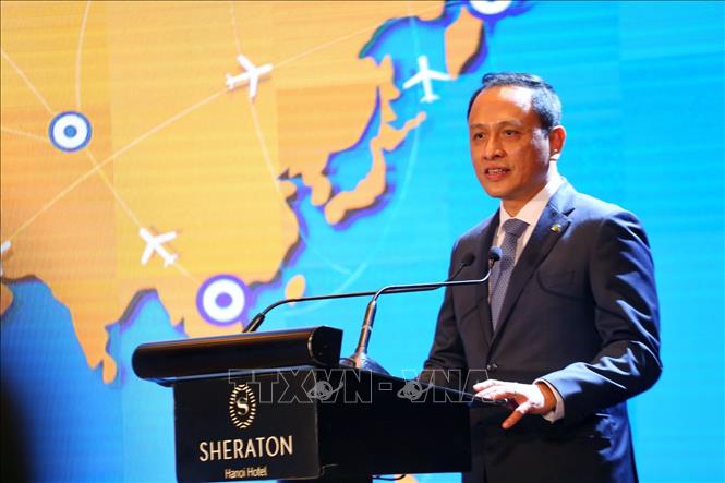 Ông Lê Hồng Hà, Tổng Giám đốc Việt Nam Airlines trình bày tham luận tại diễn đàn. Ảnh: Tuấn Đức/TTXVN |