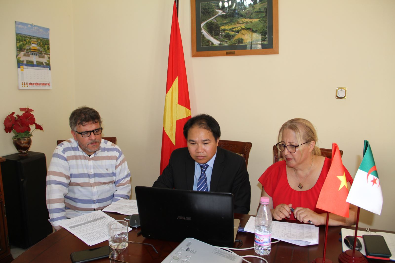 Tham tán thương mại Hoàng Đức Nhuận (giữa) cùng một số doanh nghiệpAlgeria tham gia hội nghị tại đầu cầu trụ sở Thương vụ Việt Nam tại Algeria. Ảnh: TTXVN |