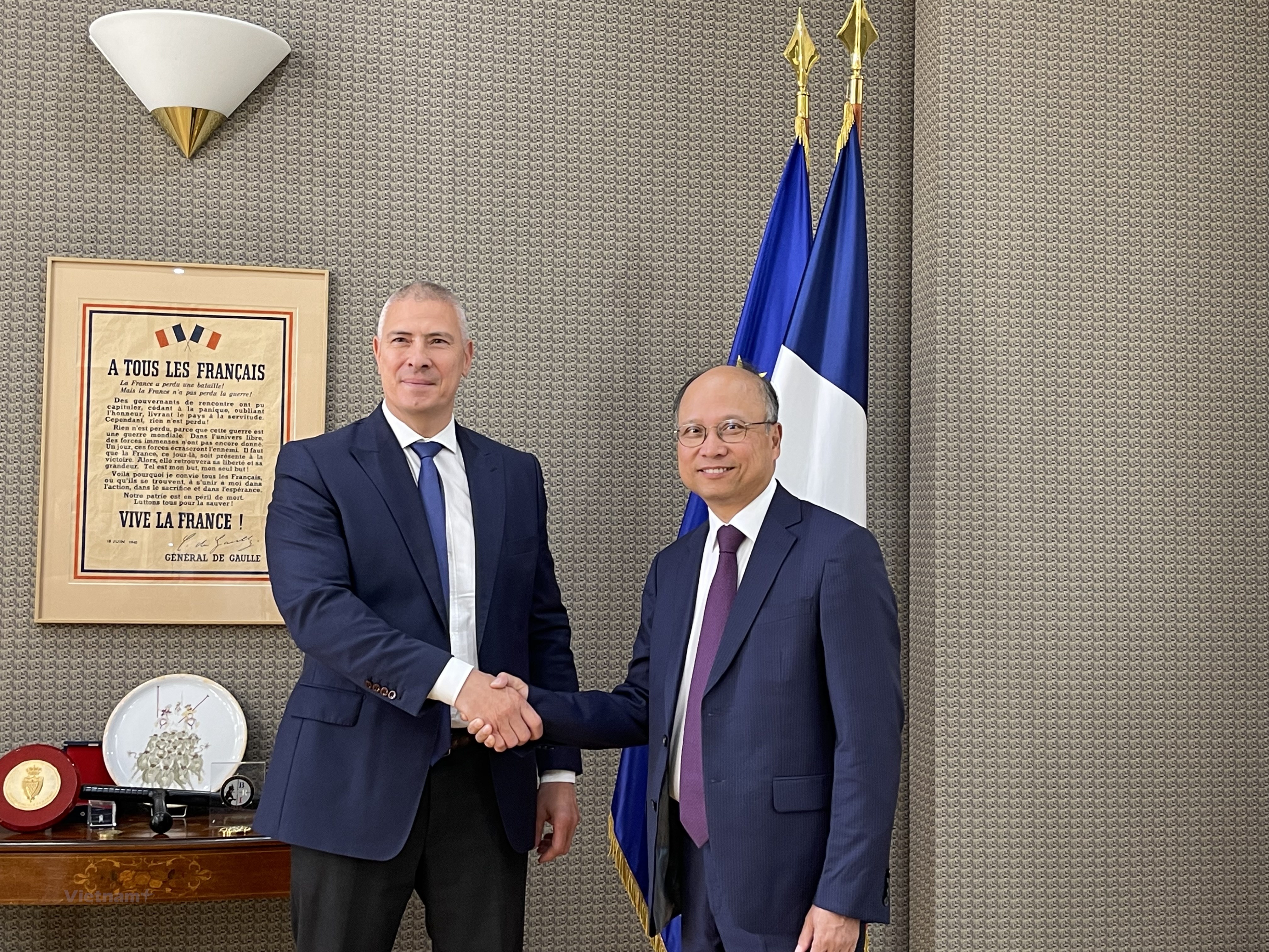 Ông Hugues Moutouh, Tỉnh trưởng tỉnh Herault tiếp Đại sứ Việt Nam tại Pháp Đinh Toàn Thắng ngày 13/6. Ảnh: Thu Hà/Vietnam |