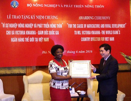Chiều 7/6, tại Hà Nội, Bộ trưởng Bộ Nông nghiệp và Phát triển nông thôn Cao Đức Phát trao Kỷ niệm chương “Vì sự nghiệp Nông nghiệp và Phát triển nông thôn Việt Nam” cho bà Victoria Kwakwa, Phó Chủ tịch Ngân hàng Thế giới phụ trách khu vực Đông Á Thái Bình Dương, nguyên Giám đốc Ngân hàng thế giới tại Việt Nam vì những đóng góp quan trọng đối với ngành nông nghiệp Việt Nam thời gian qua.