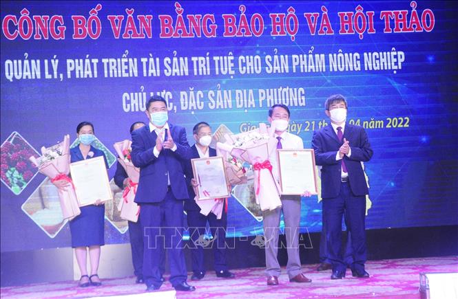 Tại buổi lễ, Cục Sở hữu trí tuệ (Bộ Khoa học và Công nghệ) đã trao văn bằng bảo hộ 5 sản phẩm nông nghiệp chủ lực, đặc sản địa phương tiêu biểu gồm: Hồ tiêu Chư Sê, Phở khô Gia Lai, Rau Đak Pơ, Gạo Ia Lâu - Chư Prông, Bò Krông Pa - Gia Lai.