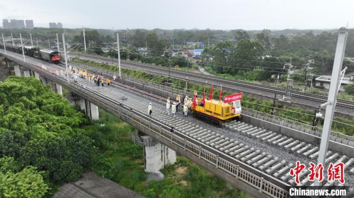Trung Quốc lắp đoạn đường ray đầu tiên trên tuyến đường sắt cao tốc kết nối với Việt Nam. Ảnh: Chinanews |