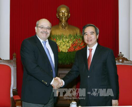 | Trưởng Ban Kinh tế Trung ương Nguyễn Văn Bình tiếp Đoàn chuyên gia IMF do ông Alex Moumouras làm trưởng đoàn, đang thăm và làm việc tại Việt Nam. Ảnh: Nguyễn Dân/TTXVN |