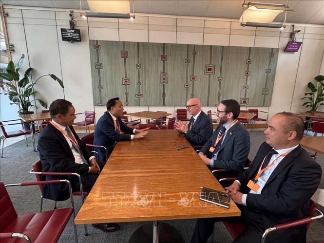 Thứ trưởng Nguyễn Hoàng Long làm việc với Nghị sĩ Matt Western (đầu bàn bên phải), Đặc phái viên Thương mại của Chính phủ Anh với Việt Nam bên lề khóa họp. Ảnh: TTXVN |