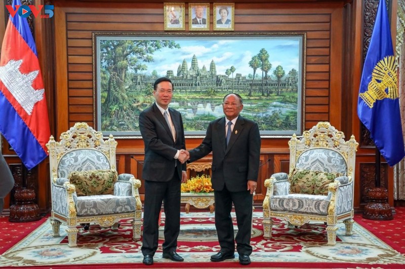 Thường trực Ban Bí thư Võ Văn Thưởng và Chủ tịch Quốc hội Campuchia Heng Samrin. Ảnh: PV VOV tại Campuchia |