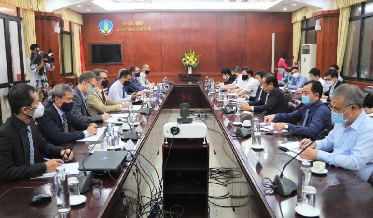 Nhằm tăng cường hợp tác Việt Nam – Liên minh Châu Âu (EU) trong lĩnh vực nông nghiệp, đặc biệt là thúc đẩy thương mại nông lâm thủy sản sau khi Hiệp định Thương mại tự do Việt Nam - EU (EVFTA) có hiệu lực từ ngày 01/8/2020, chiều nay (1/10) tại Hà Nội, Bộ trưởng Bộ Nông nghiệp và Phát triển nông thôn ông Lê Minh Hoan đã có buổi tiếp với ông Pier Giorgio Aliberti, Đại sứ Trưởng Phái đoàn Liên minh châu Âu tại Việt Nam..