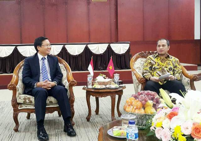 | Đại sứ Hoàng Anh Tuấn tại buổi nói chuyện với Bộ trưởng Phát triển Nông thôn, Các khu vực khó khăn và Di trú nước Cộng hòa Indonesia Marwan Jafar. |