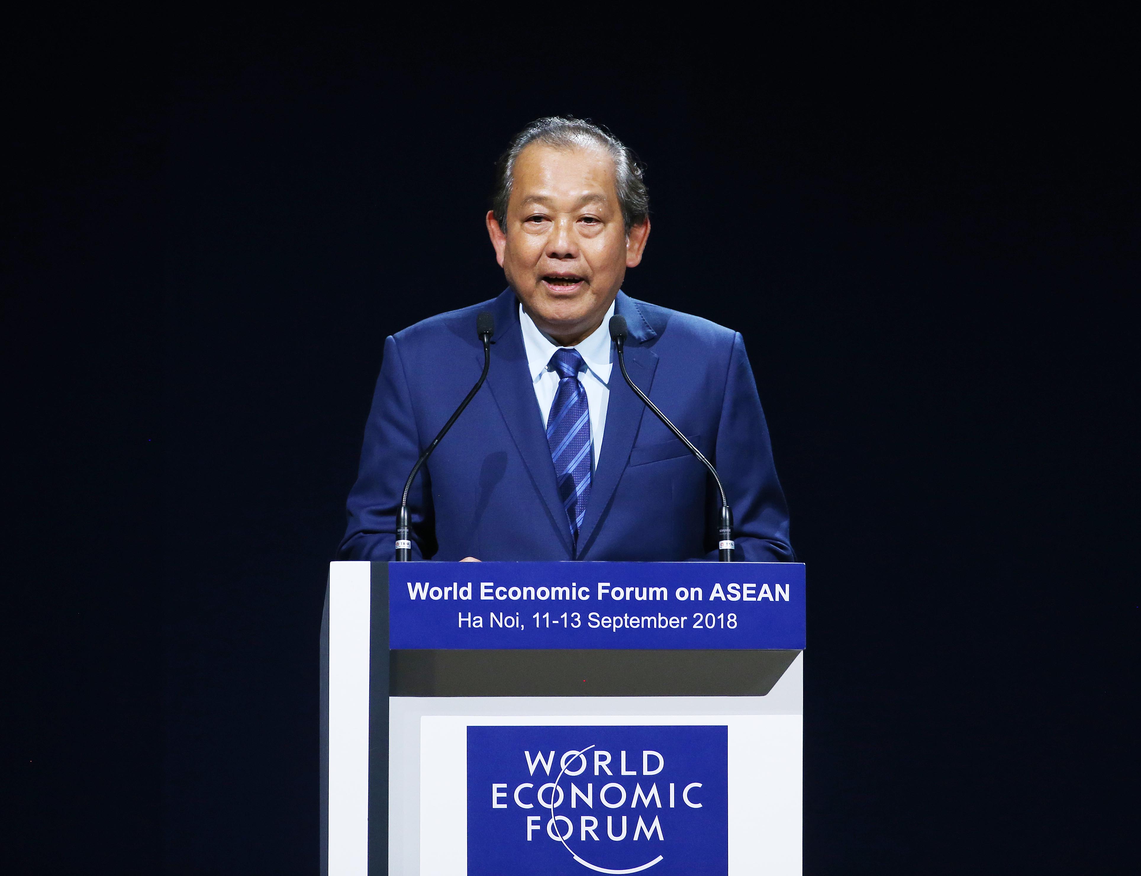Thay mặt Chính phủ Việt Nam, Phó Thủ tướng Trương Hòa Bình cảm ơn GS. Klaus Schwab - người sáng lập và Chủ tịch điều hành WEF về sự ủng hộ quý báu và phối hợp hiệu quả trong suốt quá trình chuẩn bị và tổ chức Hội nghị WEF ASEAN 2018.