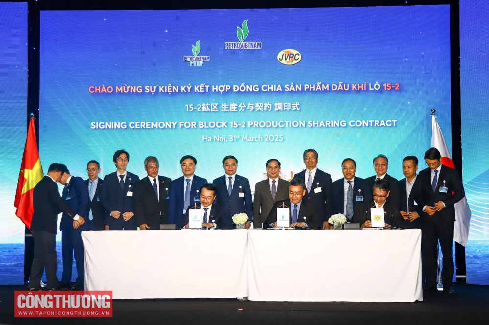 Lễ ký kết Hợp đồng Chia sản phẩm dầu khí (PSC) đối với Lô 15-2, bể Cửu Long giữa Petrovietnam, JVPC và PVEP có thời hạn 25 năm từ ngày 7/4/2025. Ảnh: tapchicongthuong.vn |