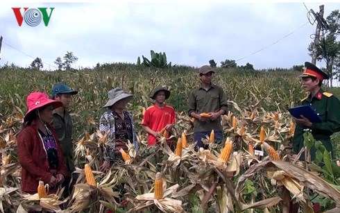Bộ đội hướng dẫn bà con dân tộc thiểu số cách thu hoạch bắp.