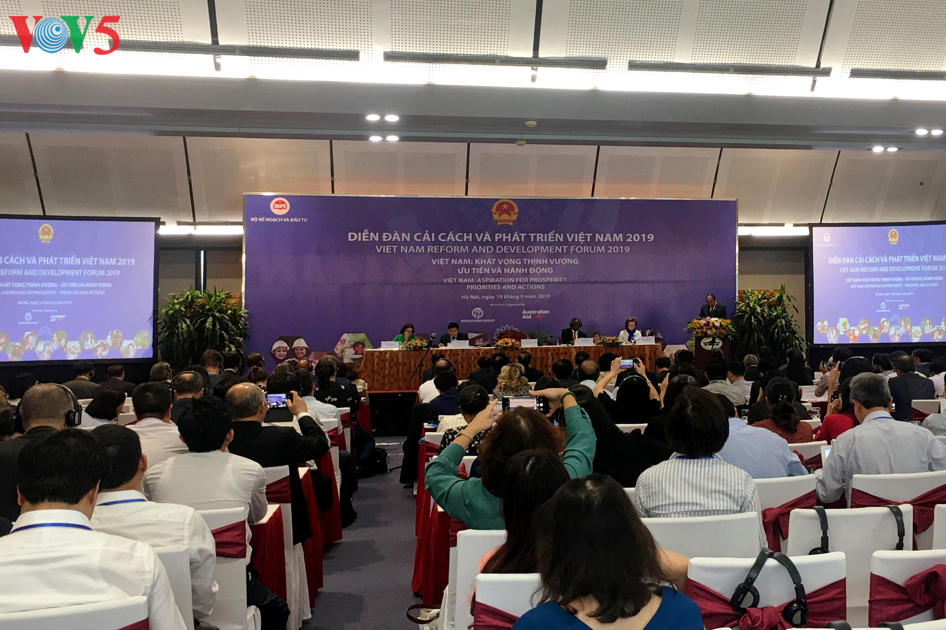 Chiều 19/09, trong khuôn khổ Diễn đàn Cải cách và Phát triển Việt Nam 2019, Thủ tướng Chính phủ Nguyễn Xuân Phúc điều hành phiên họp toàn thể với chủ đề “Hành động vì một Việt Nam thịnh vượng”. Tại phiên thảo luận, các diễn giả chia sẻ về các vấn đề liên quan đến kinh nghiệm thoát bẫy thu nhập trung bình thông qua đổi mới sáng tạo và đưa ra những khuyến nghị cho Việt Nam; chia sẻ những kinh nghiệm quốc tế về tiến lên trong chuỗi giá trị toàn cầu nhằm đạt được năng suất cao hơn; định hướng phát triển để Việt Nam trở thành quốc gia thịnh vượng đến năm 2030 và tầm nhìn đến năm 2045.
