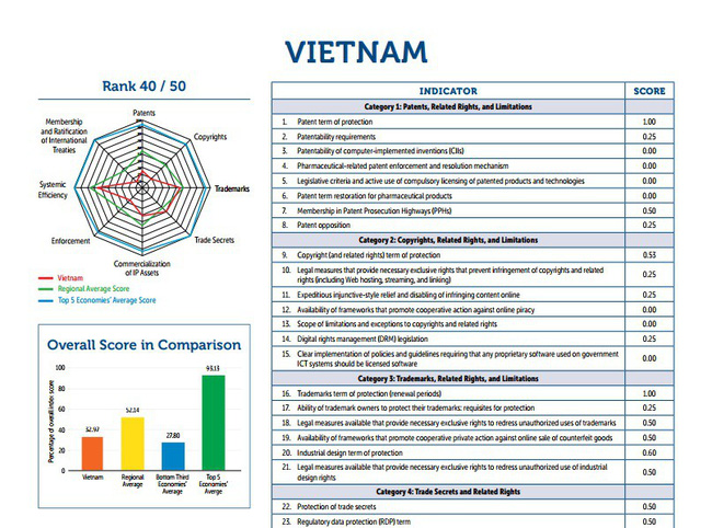 Báo cáo xếp hạng các nền kinh tế dựa trên 40 chỉ số riêng biệt để đánh giá hoạt động có vai trò quan trọng đối với sự phát triển sáng tạo liên quan đến bằng sáng chế, thương hiệu, bản quyền và bảo hộ bí mật thương mại...