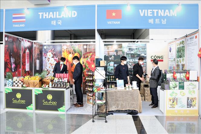 Gian hàng của Việt Nam tại Tuần lễ kinh doanh Hàn Quốc - ASEAN và Ấn Độ 2020. - Ảnh: Phạm Nguyên Anh/TTXVN |
