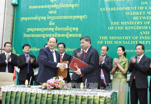 Ngày 27/07, tại trụ sở Bộ Thương mại Campuchia, diễn ra lễ ký kết biên bản ghi nhớ triển khai dự án “Chợ kiểu mẫu biên giới Campuchia” giữa Thứ trưởng Bộ Công Thương Việt Nam Nguyễn Cẩm Tú và Quốc vụ khanh Bộ Thương Mại Campuchia Mao Thora.