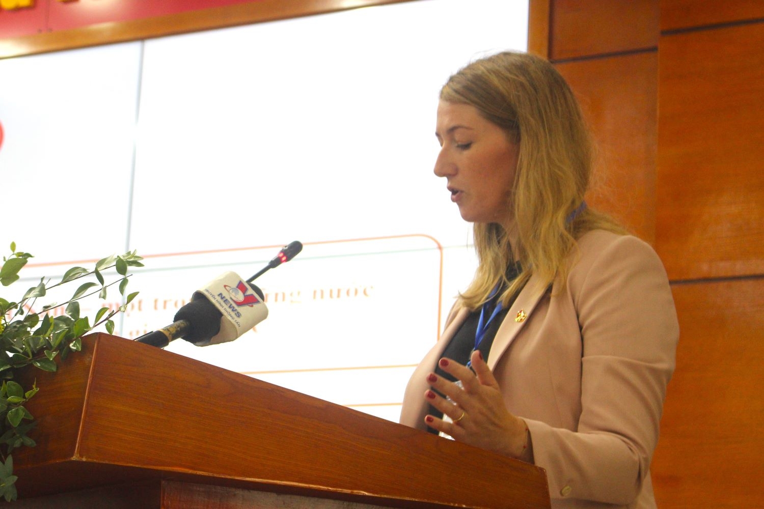 Bà Sanne Høj Andrén - Tham tán về Nông nghiệp – Thực phẩm, Đại sứ quán Đan Mạch trình bày tham luận về Hợp tác Lĩnh vực Chiến lược (SSC) về An toàn Thực phẩm trong chuỗi giá trị thịt heo. Ảnh ĐSQ Đan Mạch tại VN |