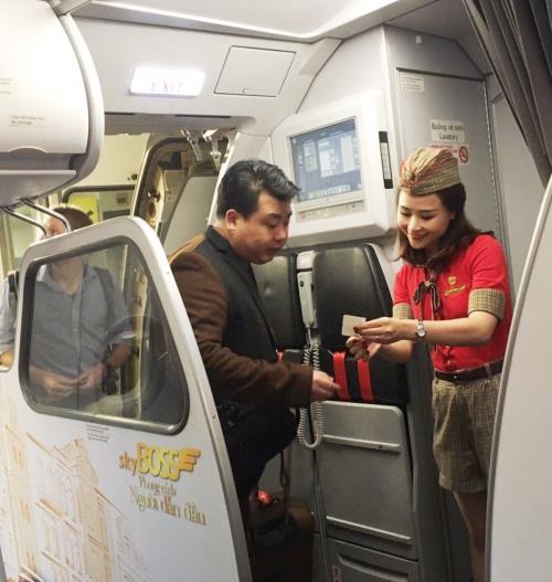 | Chào đón những khách hàng đầu tiên trên chuyến bay thành phố Hồ Chí Minh - Hongkong của Hàng hàng không Vietjet. Ảnh: Vietjet |