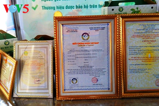 Các giấy chứng nhận chất lượng, vệ sinh an toàn thực phẩm của sản phẩm na Mai Sơn - Ảnh: Đức Anh/VOV5 |