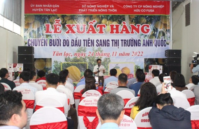 Lễ xuất hàng chuyến bưởi đỏ Tân Lạc đầu tiên sang thị trường Vương quốc Anh. Ảnh:nong nghiep.vn |