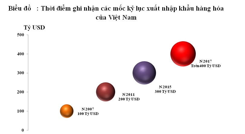 Tại buổi lễ, Phó thủ tướng Vương Đình Huệ cho biết sau 10 năm, tổng kim ngạch xuất nhập khẩu đã tăng gấp 4 lần. Cụ thể, tính tới giữa tháng 12/2017, tổng kim ngạch xuất nhập khẩu của Việt Nam đã chinh phục mốc 400 tỷ USD (hơn 9 triệu tỷ đồng). Phó Thủ tướng Vương Đình Huệ cho rằng dấu mốc kim ngạch xuất nhập khẩu hàng hoá đạt mốc 400 tỷ USD đã khẳng định chủ trương của Đảng, Nhà nước coi xuất khẩu là một trong những động lực quan trọng của tăng trưởng kinh tế.