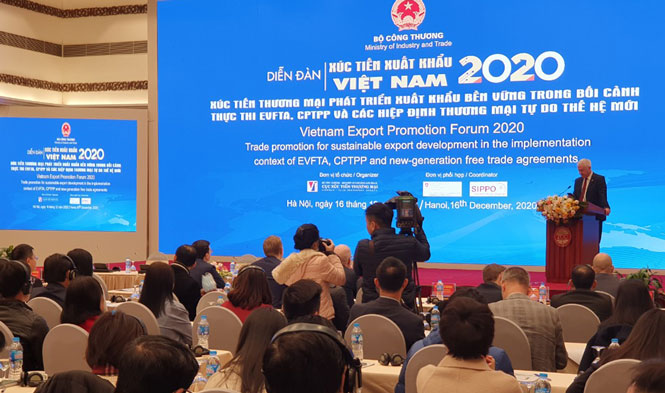 Sáng 16/12, tại Hà Nội diễn ra diễn đàn Xúc tiến thương mại, phát triển xuất khẩu bền vững trong bối cảnh thực thi Hiệp định thương mại tự do Việt Nam EU (EVFTA), Hiệp định đối tác toàn diện và tiến bộ xuyên Thái Bình Dương (CPTPP) và các hiệp định thương mại tự do thế hệ mới.