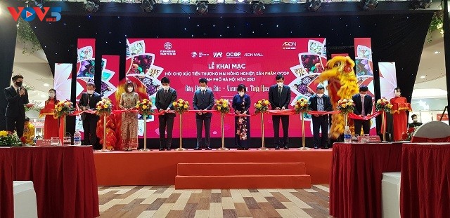 Hội chợ xúc tiến thương mại nông nghiệp, sản phẩm OCOP (Chương trình mỗi xã một sản phẩm) thành phố Hà Nội năm 2021 khai mạc tối 16/12 tại Trung tâm thương mại Aeon Mall Hà Đông, Hà Nội.