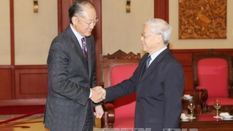 (VOV5) - Chiều 23/2, tại Trụ sở Trung ương Đảng, Tổng Bí thư Ban chấp hành Trung ương Đảng Cộng sản Việt Nam Nguyễn Phú Trọng tiếp ông Jim Yong Kim, Chủ tịch Ngân hàng Thế giới, đang ở thăm Việt Nam.