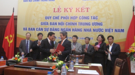 (VOV5)- Chiều 10/3 tại Hà Nội, diễn ra lễ kí kết quy chế phối hợp giữa Ban Nội chính Trung ương với Ban cán sự Đảng Ngân hàng Nhà nước.