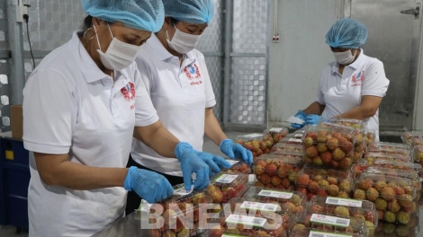 (VOV5) - Vải thiều Bắc Giang được xuất khẩu tại thời điểm này tuân thủ theo những tiêu chuẩn phòng chống dịch COVID-19 hết sức nghiêm ngặt.