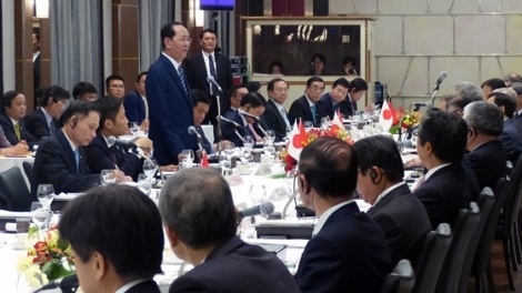 (VOV5) - Ngày 30/05, Chủ tịch nước Trần Đại Quang gặp gỡ, đối thoại với các Chủ tịch tập đoàn lớn là thành viên của Liên đoàn Kinh tế Nhật Bản Keidairen, Phòng Thương mại công nghiệp Nhật Bản (JCCI) và một số tổ chức kinh tế lớn của Nhật Bản.