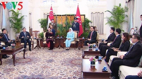 (VOV5) - Trong khuôn khổ chuyến thăm chính thức Singapore, chiều 27/11, Chủ tịch Quốc hội Nguyễn Thị Kim Ngân chào xã giao Tổng thống Singapore Halimah Jaco.