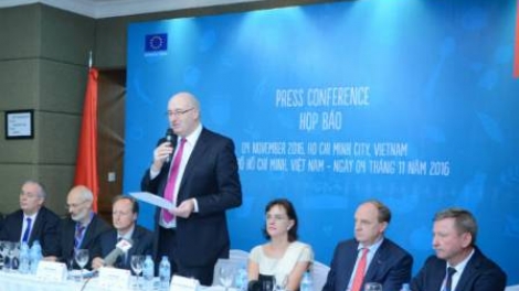 (VOV5) - Ngày 4/11, ông Phil Hogan, Cao ủy Nông nghiệp và Phát triển Nông thôn phụ trách quản lý Chính sách Nông nghiệp chung của Liên minh châu Âu (EU) dẫn đầu đoàn thương mại cấp cao cùng hơn 40 doanh nghiệp nông sản, thực phẩm làm việc tại Thành phố Hồ Chí Minh.
