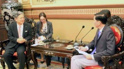 (VOV5) - Chiều 12/8, ông Trần Vĩnh Tuyến, Phó Chủ tịch UBND Thành phố Hồ Chí Minh, tiếp ông Hideo Okubo, Chủ tịch Tập đoàn Forval (Nhật Bản) đang thăm và tìm hiểu cơ hội hợp tác tại Thành phố Hồ Chí Minh