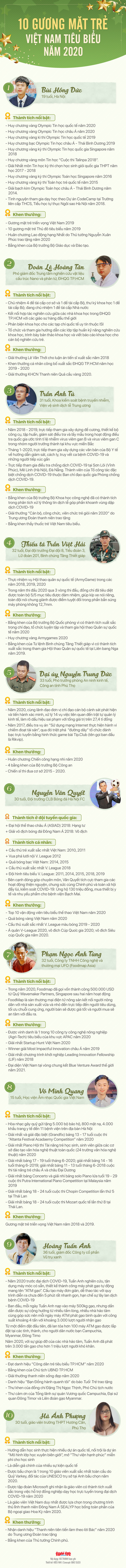 Hội đồng xét chọn giải thưởng Gương mặt trẻ Việt Nam tiêu biểu 2020 vừa công bố 10 gương mặt xuất sắc nhất đoạt giải thưởng Gương mặt trẻ Việt Nam tiêu biểu năm 2020, thuộc 9 lĩnh vực: Học tập; Nghiên cứu khoa học - sáng tạo; Lao động sản xuất; Kinh doanh - khởi nghiệp; Quốc phòng; An ninh trật tự; Thể dục thể thao; Văn hóa nghệ thuật; Hoạt động xã hội.