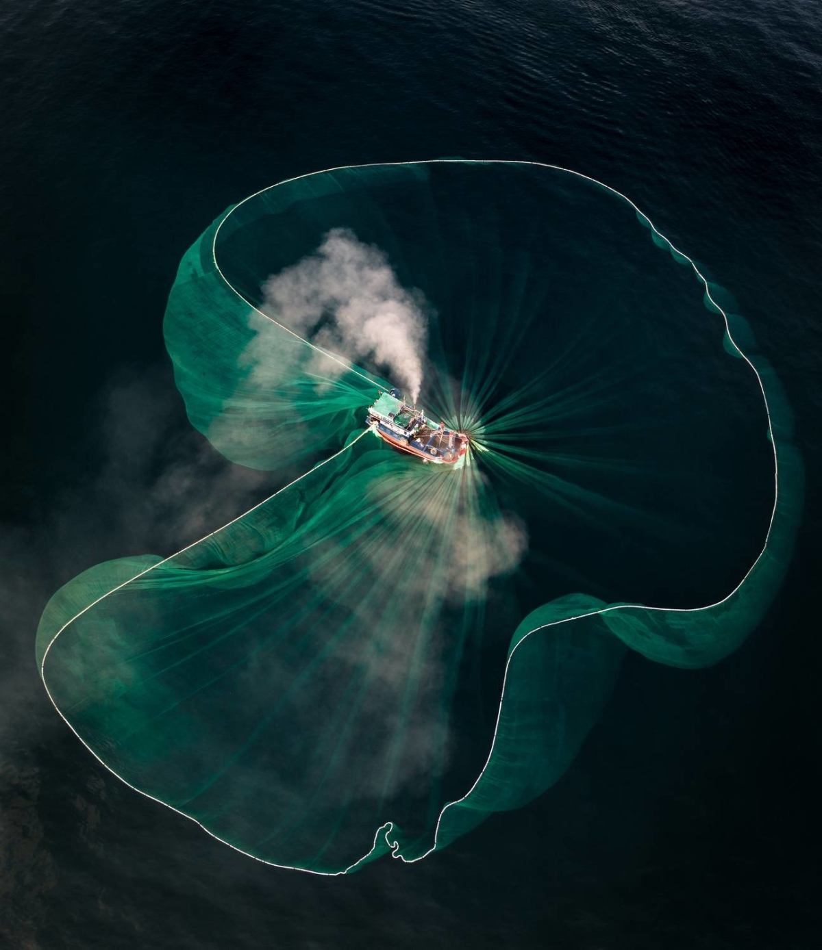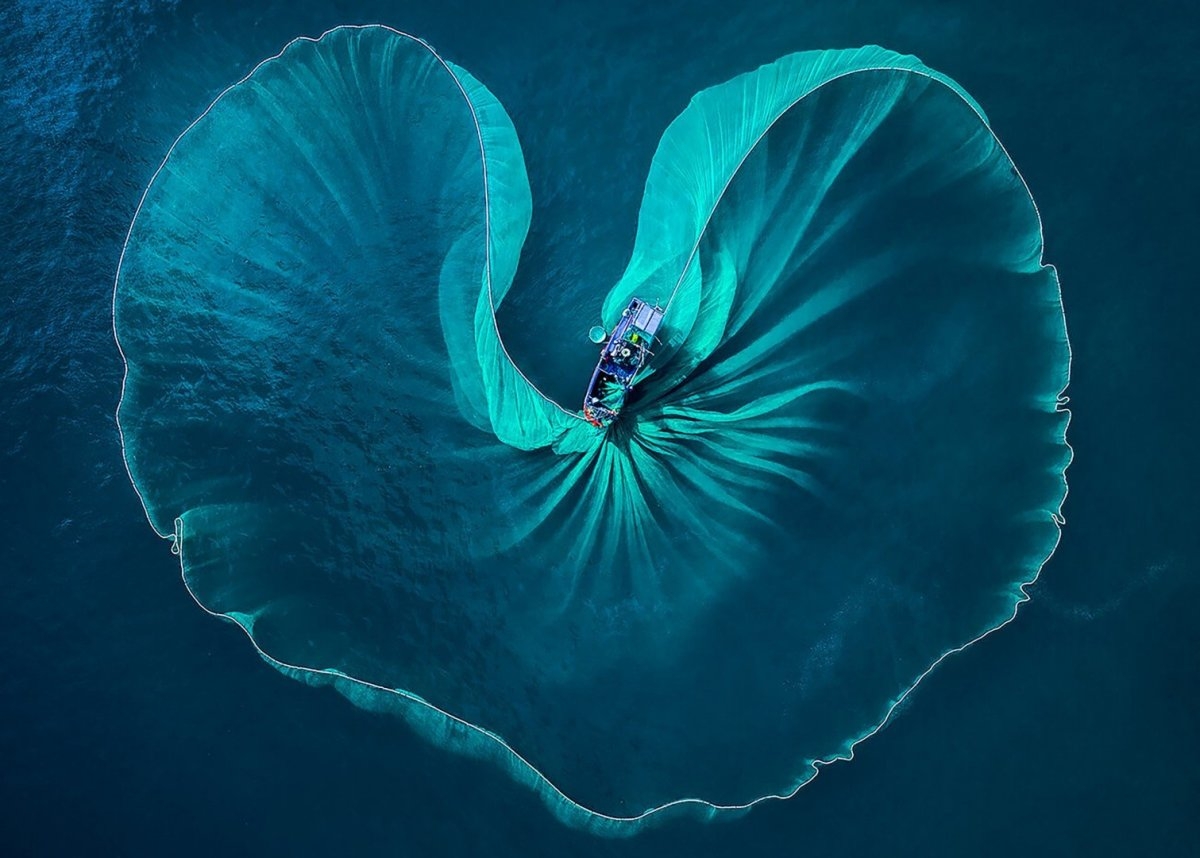 Bức ảnh quăng lưới chụp từ trên cao của nhiếp ảnh gia Nguyễn Phước Hoài với tựa đề "Trái tim của biển" đạt giải danh dự ở cuộc thi All About Photo 2021. Nguyễn Phước Hoài chụp cảnh quăng lưới đánh bắt cá vào một buổi sớm ở Phú Yên. Tác giả chia sẻ: "Nhìn từ trên cao lưới quăng ra tạo hình như trái tim. Với những ngư dân ở đây, bắt được đầy thuyền cá tôm không chỉ là niềm hạnh phúc mà còn là món quà tự nhiên trao cho họ". |