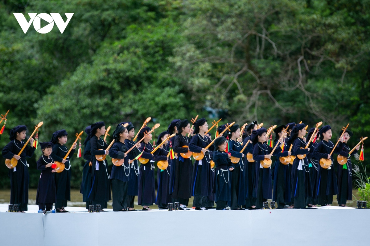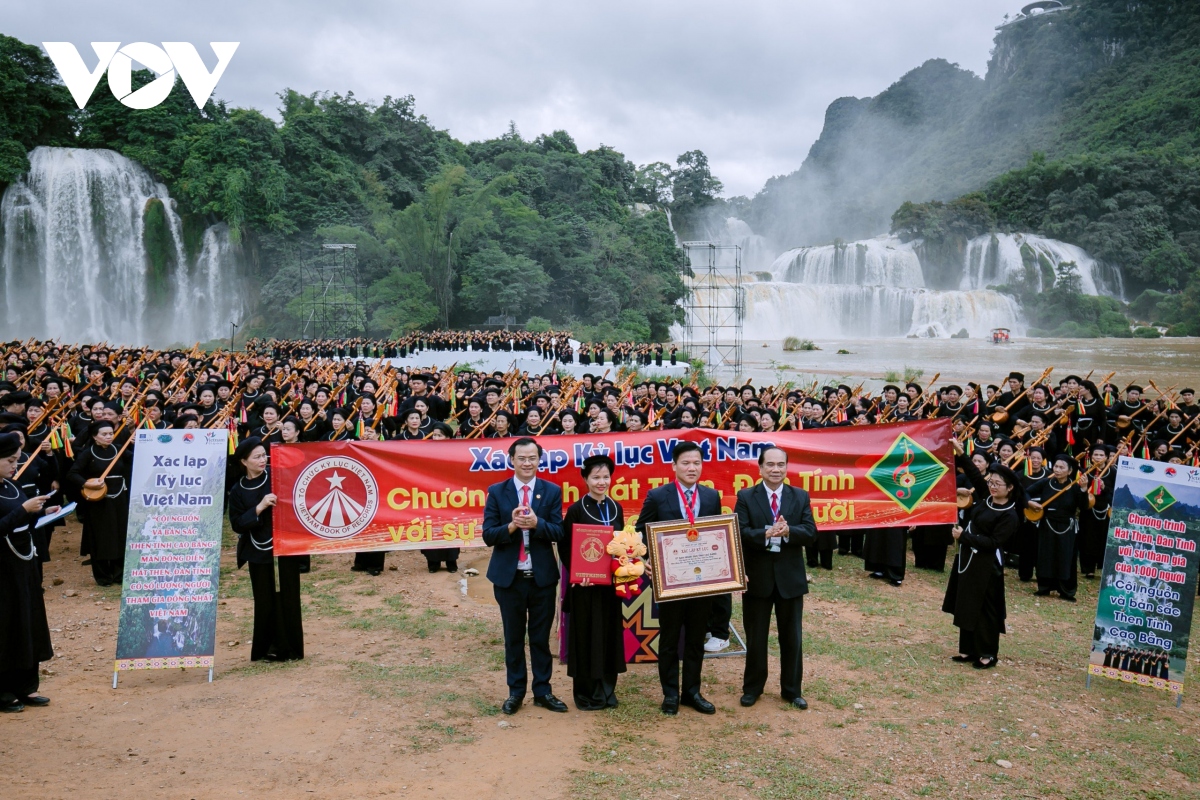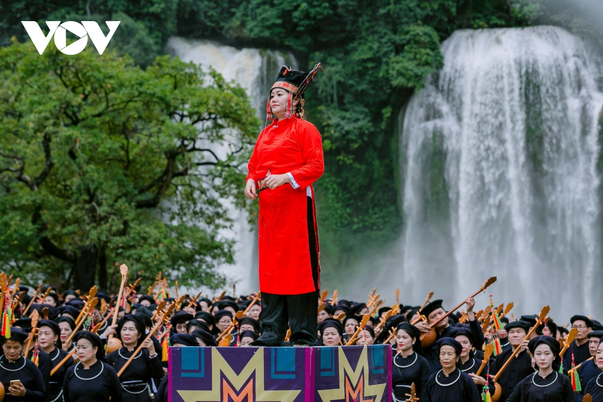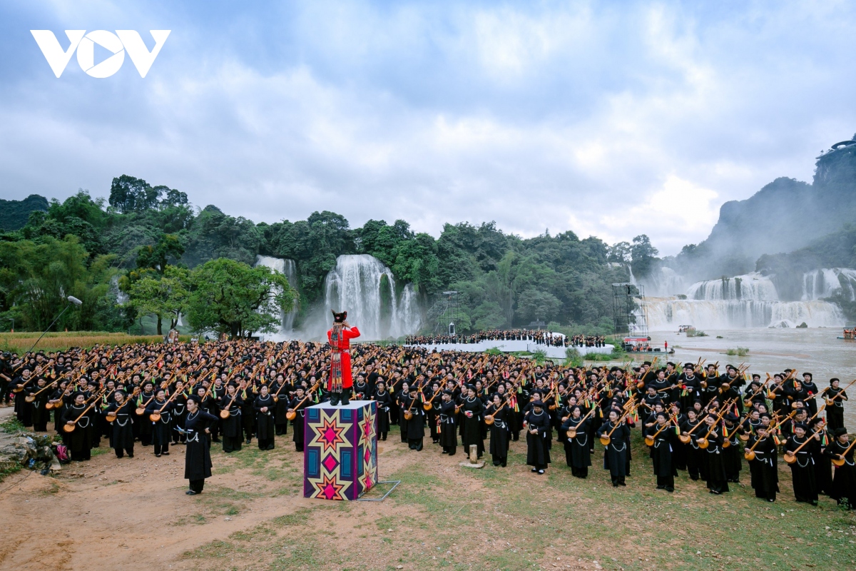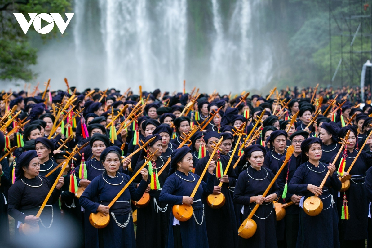 Bên dòng thác Bản Giốc hùng vĩ, 1.000 người gồm các nghệ nhân, người yêu nhạc dân tộc, học sinh, sinh viên… đủ lứa tuổi trong những bộ trang phục truyền thống Tày- Nùng đã cùng biểu diễn chương trình hát then đàn tính mang chủ đề “Cội nguồn và Bản sắc then tính Cao Bằng". |