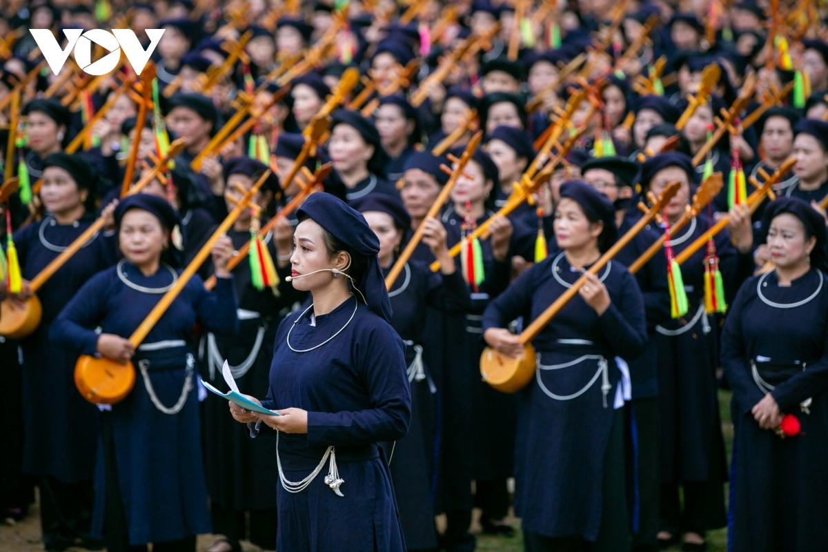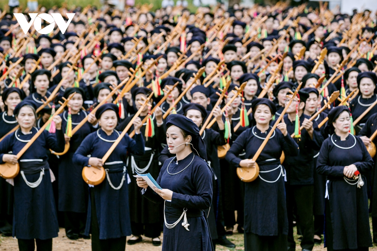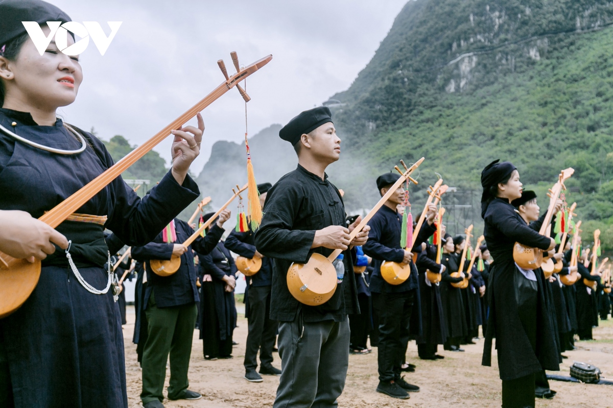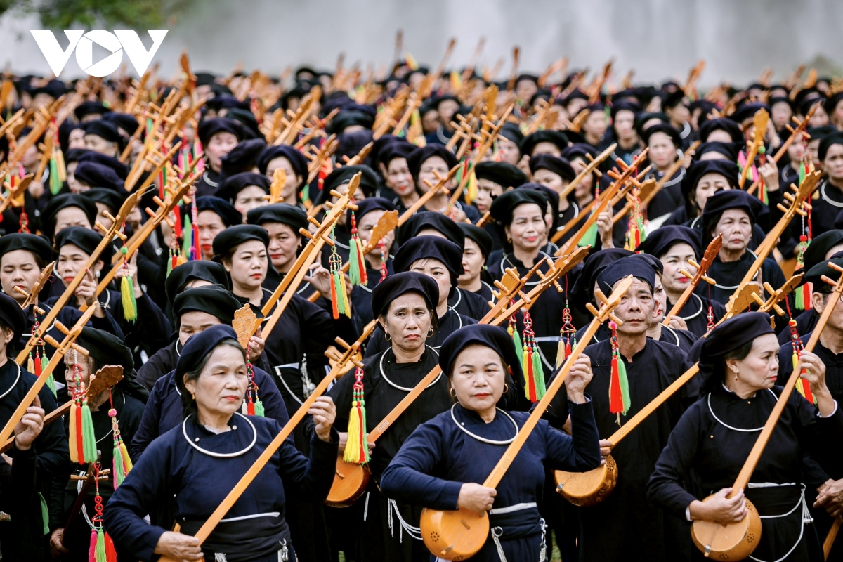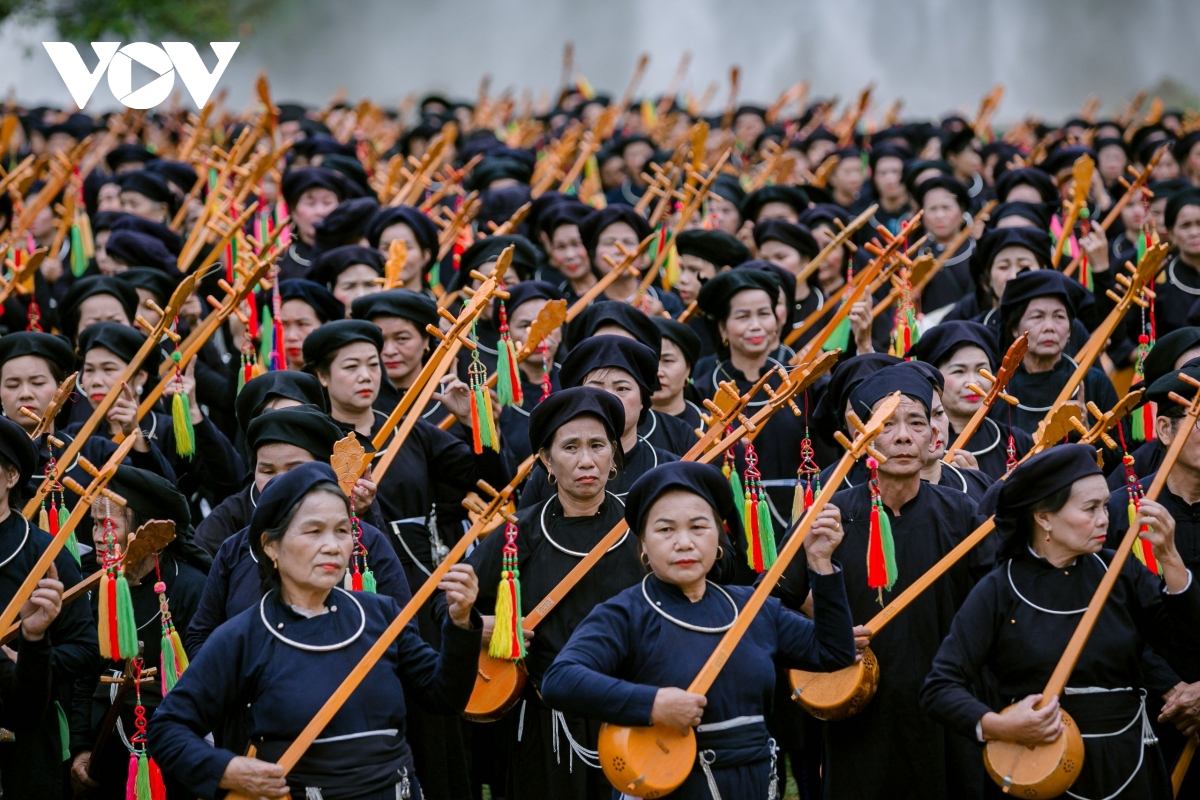 Bên dòng thác Bản Giốc hùng vĩ, 1.000 người gồm các nghệ nhân, người yêu nhạc dân tộc, học sinh, sinh viên… đủ lứa tuổi trong những bộ trang phục truyền thống Tày- Nùng đã cùng biểu diễn chương trình hát then đàn tính mang chủ đề “Cội nguồn và Bản sắc then tính Cao Bằng". |