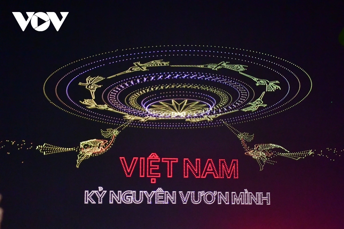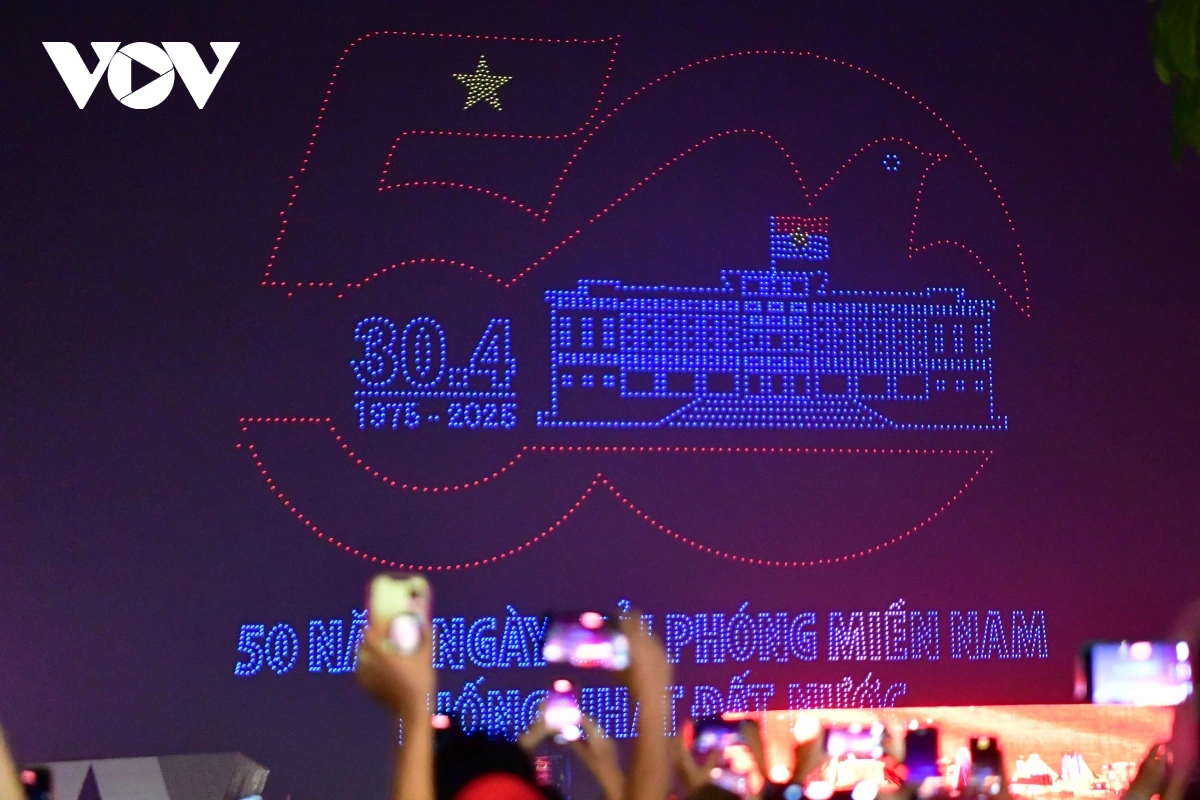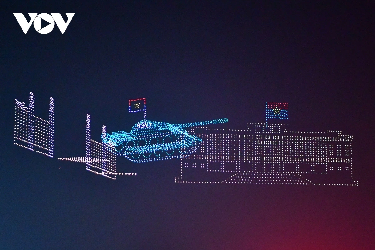 | Trong buổi tổng duyệt kéo dài 15 phút, các drone bay trên cao và xếp thành những hình ảnh mang biểu tượng thể hiện quá trình phát triển của TP. Hồ Chí Minh (TP.HCM) và chào mừng 50 năm thống nhất đất nước. Ảnh: Hoàng Long/VOV.VN |