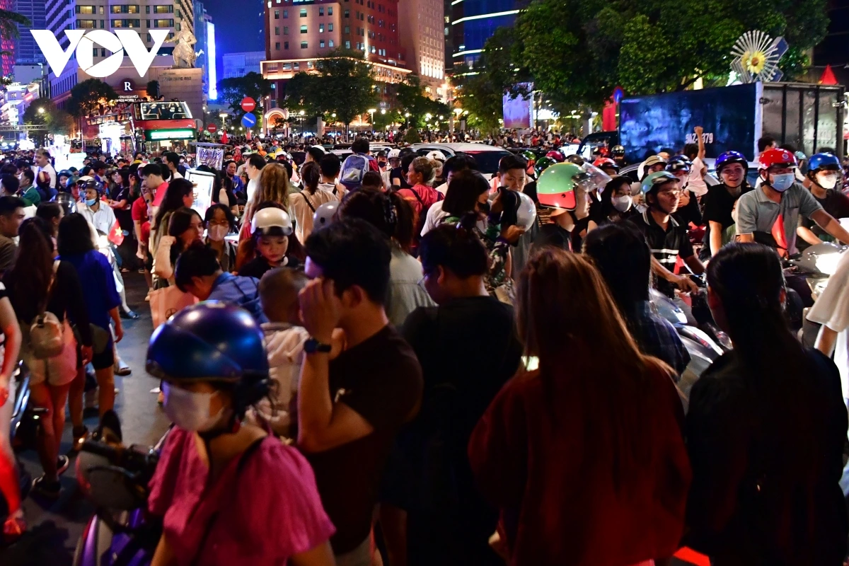 | Sức hút của buổi tổng duyệt khiến tuyến đường dọc theo sông Sài Gòn và khu vực trung tâm TP.HCM kẹt cứng. Ảnh: Hoàng Long/VOV.VN |