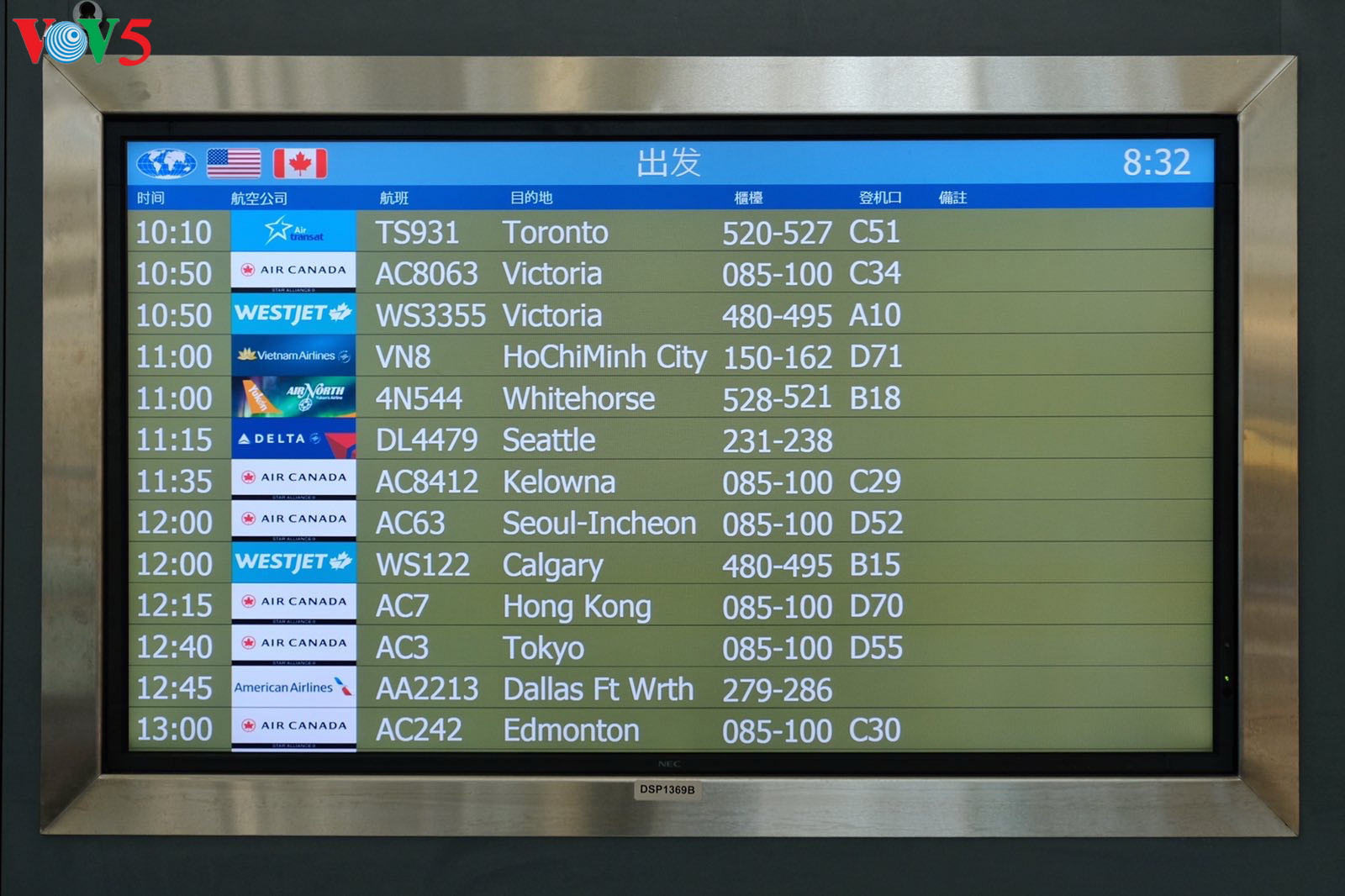 | Bảng thông báo chuyến bay từ Vancouver, Canada đến Chitose, Nhật Bản |