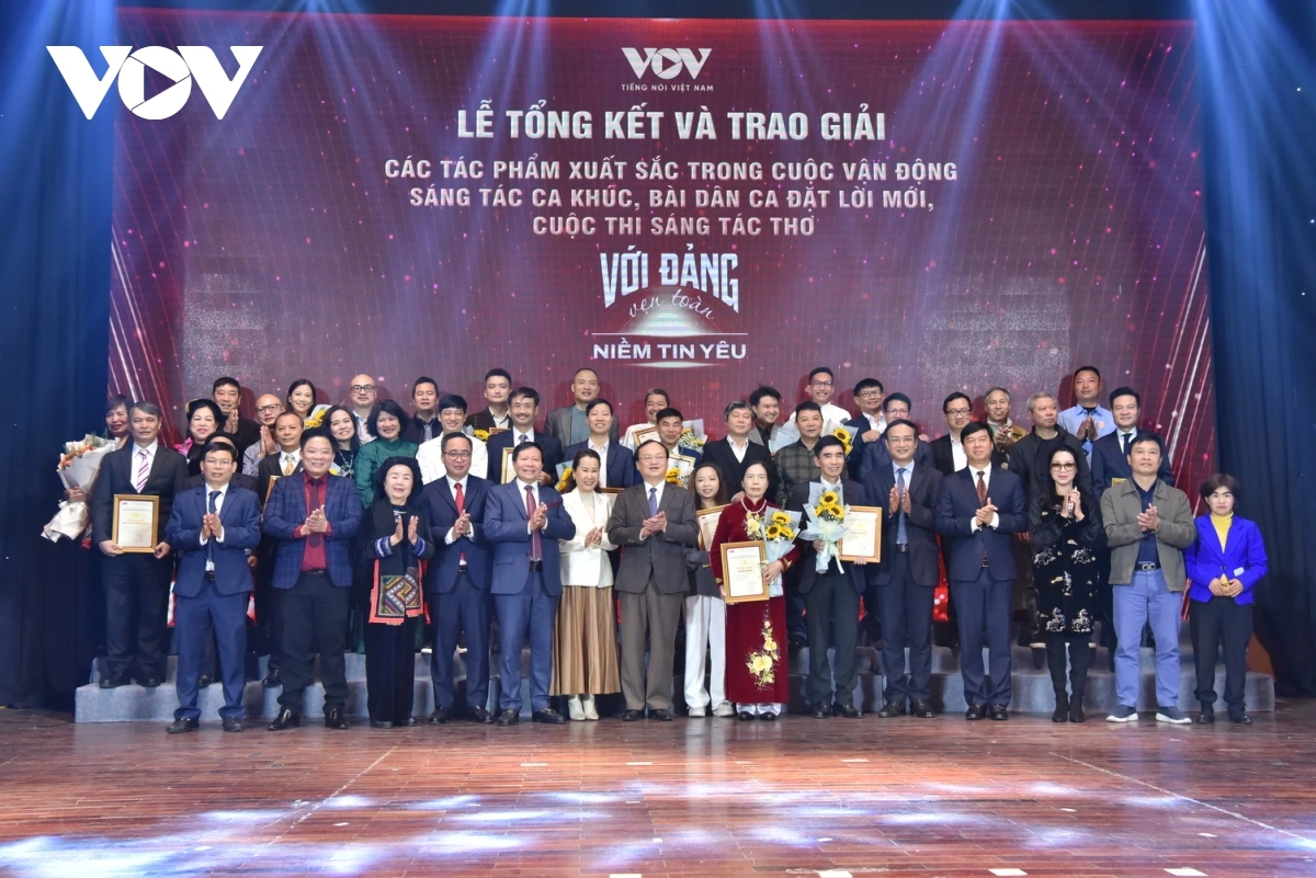 | Sáng 28/12, tại Trung tâm Phát thanh quốc gia (58 Quán Sứ, Hà Nội), Ban Văn học – Nghệ thuật – Âm nhạc (VOV3) tổ chức Lễ Tổng kết và trao giải Cuộc vận động sáng tác Ca khúc, Bài dân ca đặt lời mới và Cuộc thi sáng tác thơ “Với Đảng vẹn toàn niềm tin yêu”. Cuộc vận động sáng tác do VOV3 phát động là một hoạt động ý nghĩa gửi gắm tình yêu Tổ quốc, niềm tin vào sự lãnh đạo của Đảng Cộng sản Việt Nam của các tác giả trong và ngoài nước. Có tổng cộng 40 giải thưởng được Hội đồng Giám khảo lựa chọn để trao cho các tác giả của 3 thể loại Ca khúc, Bài dân ca đặt lời mới, Tác phẩm Thơ. |