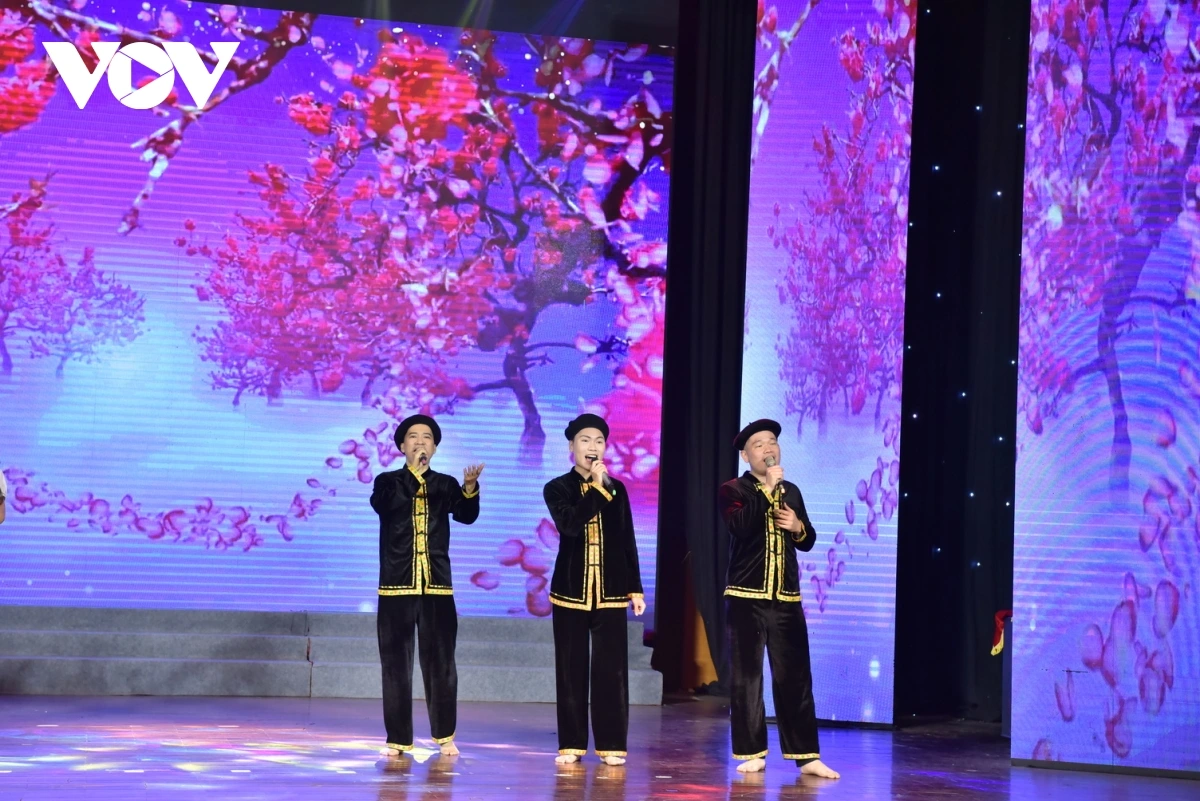 | Ông Vũ Hải Quang và ông Nguyễn Văn Chí trao chứng nhận và hoa cho các tác giả đạt giải Ba thể loại Bài dân ca đặt lời mới. |