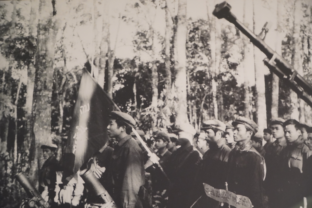 Mùa Xuân năm 1971, quân dân Việt Nam phối hợp chặt chẽ cùng nhân dân các bộ tộc và lực lượng vũ trang cách mạng Lào tổ chức thực hiện thành công chiến dịch Đường 9 - Nam Lào giành thắng lợi vang dội. Trong ảnh: Quân tình nguyện Việt Nam và bộ đội Lào làm lễ xuất quân trước khi bước vào trận chiến đấu tại Sảm Thông, Long Chẹn, trong chiến dịch Cánh Đồng Chum, Xiêng Khoảng, Lào, tháng 12/1971. |