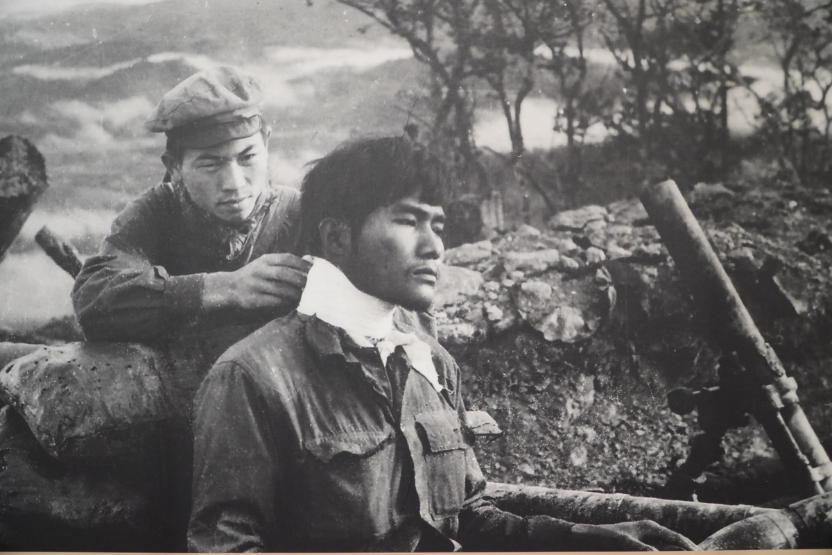 Bộ đội Lào băng bó vết thương cho bộ đội Việt Nam trong trận chiến đấu tại Sảm Thông, Long Chẹn trong chiến dịch Cánh Đồng Chum, Xiêng Khoảng, Lào, tháng 12/1971. |
