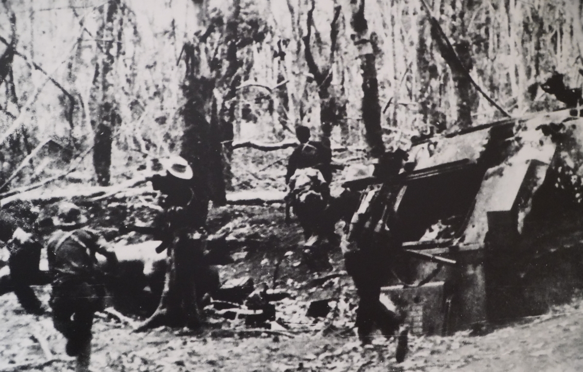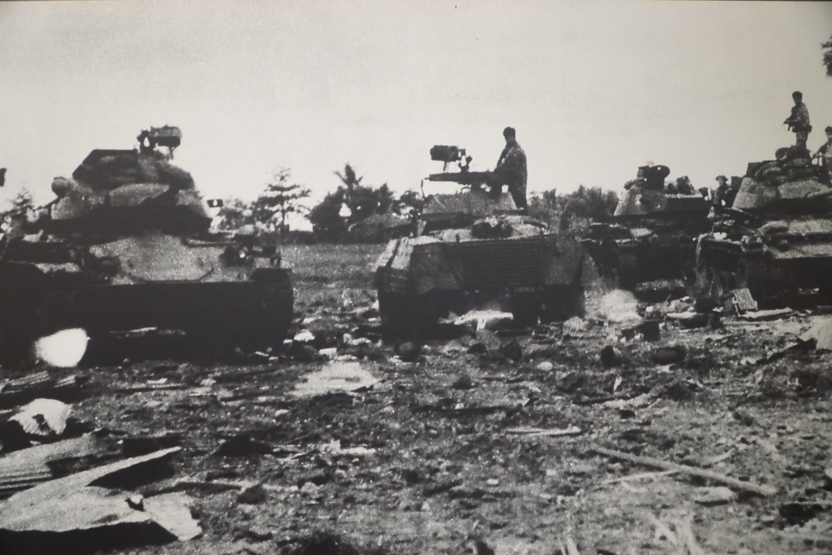 Trên hướng đông bắc Campuchia, Quân giải phóng miền Nam phối hợp với lực lượng kháng chiến và nhân dân Campuchia mở chiến dịch phản công, chặn đánh địch trên từng khu vực, đánh nhiều trận tập kích, phục kích, sau chuyển sang bao vây tiến công... đập tan cuộc hành quân “Toàn thắng 1/71” của quân Sài Gòn, loại khỏi vòng chiến đấu hơn 20.000 địch. Trong ảnh: Liên quân Việt Nam – Campuchia đánh bại hoàn toàn cụm phòng ngự bằng xe tăng và xe bọc thép của quân nguỵ Campuchia tại căn cứ Ba Rai, tỉnh Công pông thom, góp phần đánh bại cuộc hành quân ‘Chen La 2’ của chúng, năm 1971. |