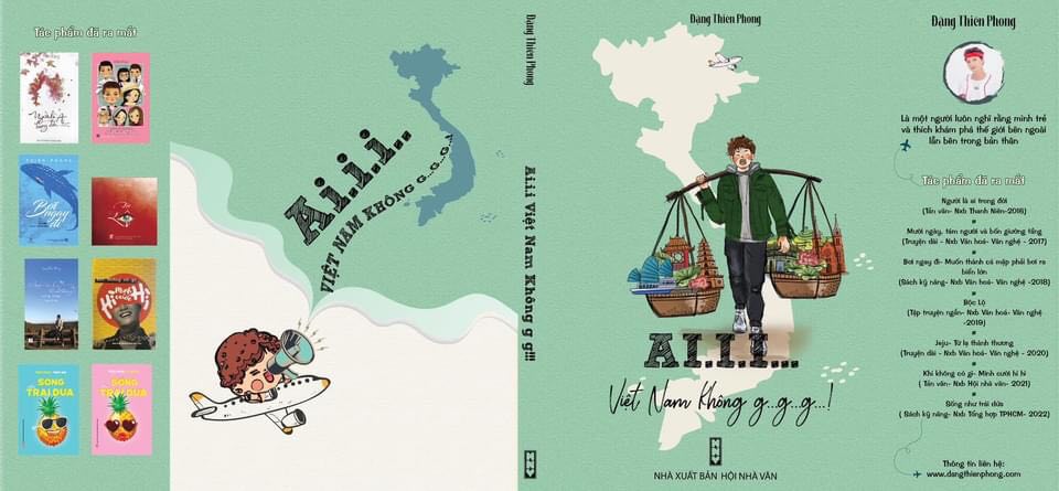 Ai..i…i… Việt Nam không…g…g? - Nhà xuất bản (NXB) Hội Nhà văn. Cuốn nhật ký du khảo nhiều chất thơ và đầy thú vị của nhà văn trẻ TP. Hồ Chí Minh Đặng Thiên Phong (sinh năm 1993) vừa được phát hành đầu xuân 2023. Một chấm phá qua 5 tỉnh thành từ Bắc xuống Nam: Lào Cai, Quảng Ninh, Nghệ An, Huế, Ninh Thuận mà tác giả trải nghiệm nhiều nhất từ các chuyến đi làm phim, khơi cảm hứng đến bất kỳ ai, ít nhất một lần trong đời, sẽ tham quan một nơi nào đó bất kỳ trong 63 tỉnh, thành của đất nước.